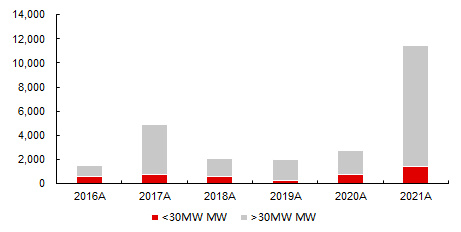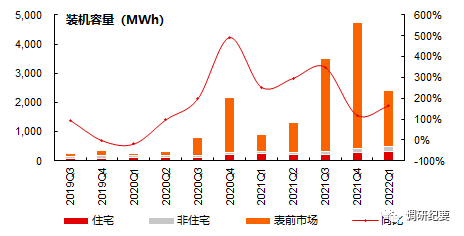 1)WoodMac口徑,美國2021年儲能裝機(jī)10.5GWh,同比增長198%,其中表前大型儲能9.1GWh,占比87%;2022Q1美國儲能裝機(jī)2.4GWh,同比增長163%,其中表前儲能1.9GWh;美國表前市場因鋰電池供給和價格因素,有部分項(xiàng)目推遲,但需求并未消失,是后續(xù)延續(xù)高增長的基礎(chǔ);預(yù)計2022年裝機(jī)超20GWh,采購需求40GWh。