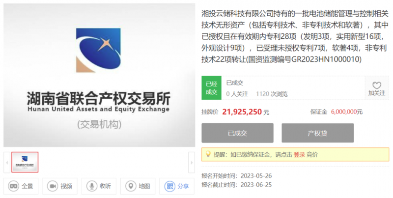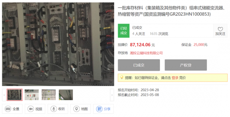 據了解,從2023年4月28日開始,湘投云儲就已經在公開平臺拍賣其相關儲能產品和技術專利。