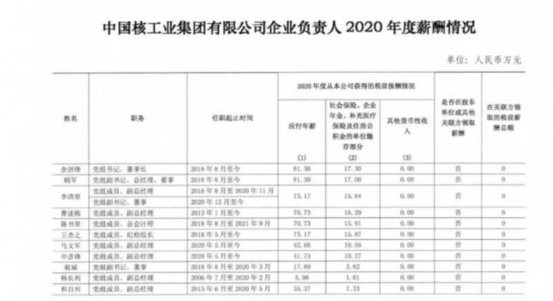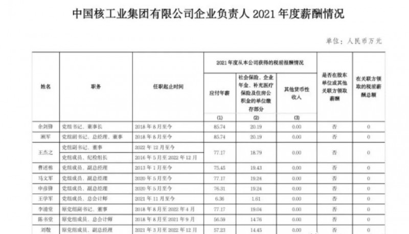 其中,黨組書記、董事長余劍鋒在2022年度從中核集團獲得的稅前報酬為89.2萬元,2021年為85.74萬元,2020年為81.3萬元。