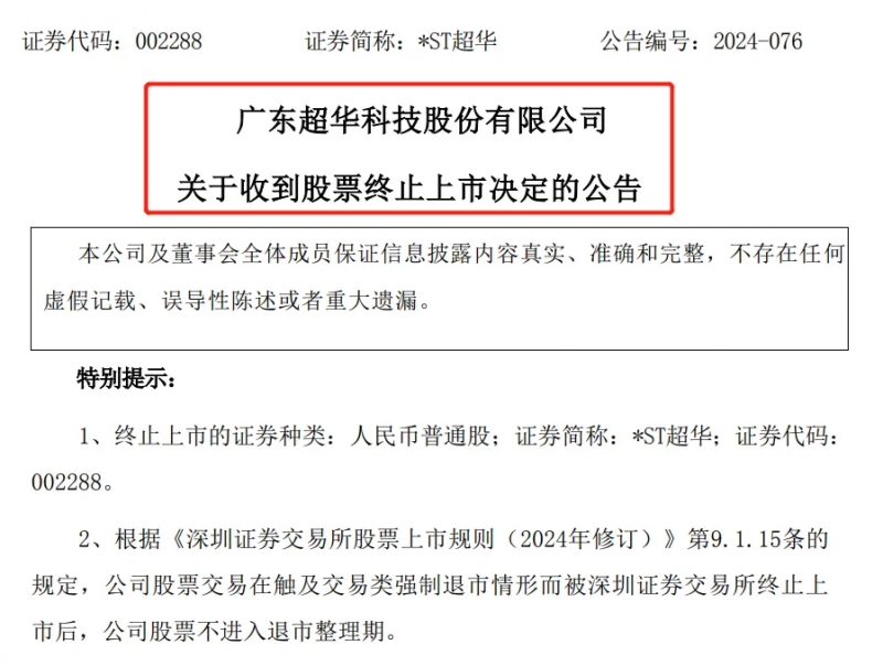 值得一提的是,8月5日,*ST超華公告稱,公司于2024年8月5日收到深圳證券交易所出具的《關于廣東超華科技股份有限公司股票終止上市的決定》,深交所決定終止公司股票上市。根據相關規定,公司股票觸及交易類強制退市情形,不進入退市整理期,將于深交所作出終止上市決定后十五個交易日內摘牌。