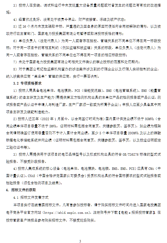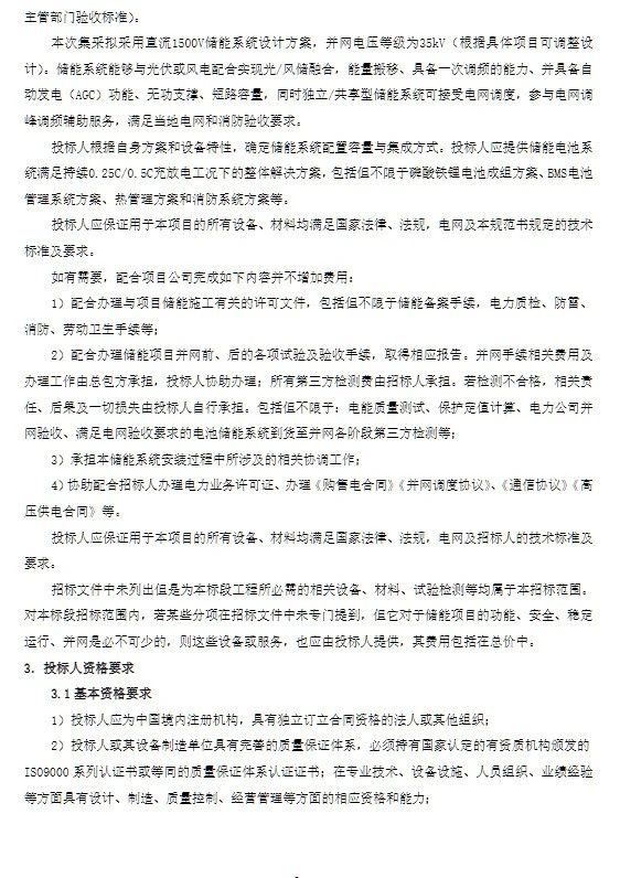 2)投標人近三年(2022年 1月至今,以合同簽訂時間為準)國內累計供貨業(yè)績不低于 8GMWh(合同業(yè)績單體項目容量不低于 5MWh,證明材料需包括合同首頁、關鍵參數頁、簽字頁),如業(yè)績?yōu)榭蚣芎贤埫鞔_簽訂使用容量否則不予計入累計合同業(yè)績。至少 5個單體項目容量 200MWh及以上的磷酸鐵鋰電化學儲能系統(tǒng)并網業(yè)績(證明材料需包括合同首頁、關鍵參數頁、簽字頁,以及投運證明或竣工驗收證書等)。