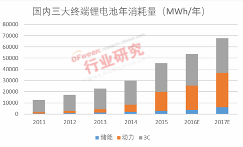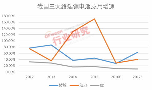 而從增速上看,2016年3C鋰電池增速約10.7%,較2015年明顯回落,動力鋰電池增速約為28.8%,增速回落較大,儲能鋰電發展相對平穩。OFweek新能源行業分析師潘瑤認為,動力鋰電池仍會保持增長,但由于基數較大,很難再有突破性的增長,未來儲能鋰電池市場或將呈現爆發式增長,儲能作為“十三五”規劃百大工程項目,經過近4年的導入期之后,即將進入高速成長期,而且目前基數較低,發展潛力巨大。