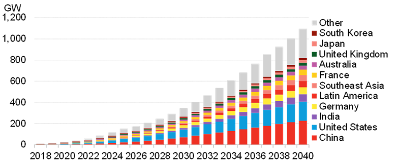 2018到2040年全球累計儲能部署預測