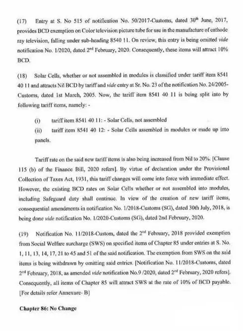 值得注意的是:太陽能電池和太陽能組件的共同關稅編碼 (CTH), 8541.40.11被分成兩個標題。現在太陽能電池(未組裝的)將歸類于8541.40.11,太陽能電池組裝成的組件,將歸類于8541.40.12。這項規定立即生效。上述兩類產品的稅率相同,均為20%。從表面上看,財政部希望對電池和組件制定一個不同的關稅制度,而擁有兩個獨立的關稅編碼可以使這一過程更容易。這是一個信號,財政部正在將電池片和組件的征稅制度進細分管理。