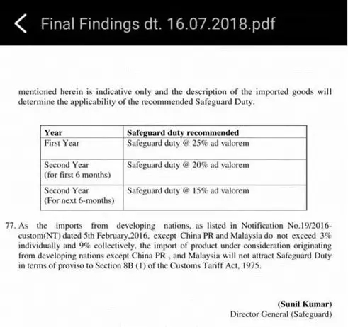 圖片:印度在2018年7月公布的最終保障稅