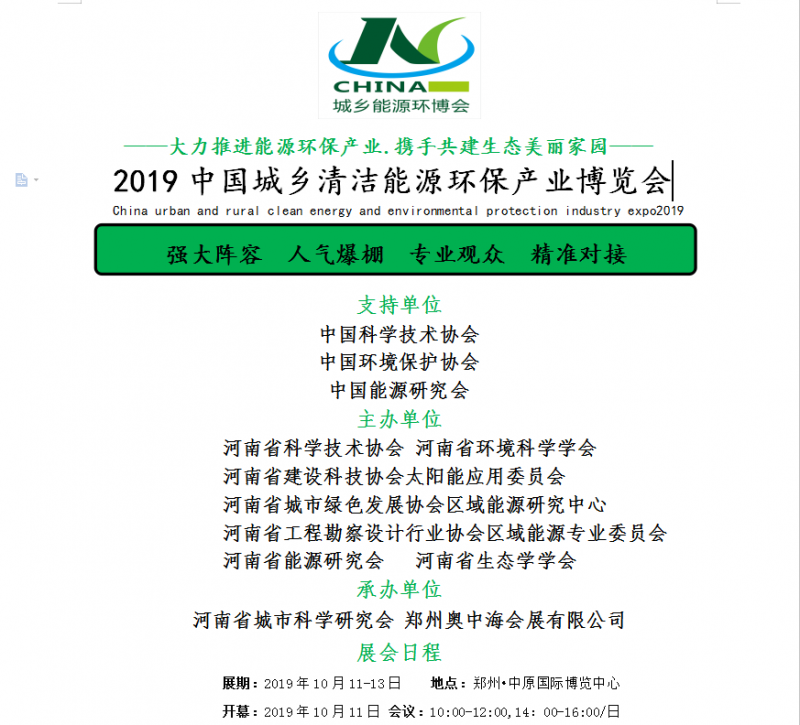 2019中國(guó)城鄉(xiāng)清潔能源環(huán)保產(chǎn)業(yè)展,強(qiáng)勢(shì)回歸,在中國(guó)·鄭州10月盛大開(kāi)幕,得到了中國(guó)科學(xué)技術(shù)協(xié)會(huì)、中國(guó)環(huán)境保護(hù)協(xié)會(huì)、中國(guó)能源研究會(huì)、河南省科學(xué)技術(shù)協(xié)會(huì)、河南省環(huán)境科學(xué)學(xué)會(huì)、河南省建設(shè)科技協(xié)會(huì)等單位重點(diǎn)支持、主辦,以及廣大知名企業(yè)和經(jīng)銷(xiāo)商的支持和積極響應(yīng)。大會(huì)立足中部輻射全國(guó),總面積達(dá)20000余平米,專(zhuān)業(yè)觀眾30000余人,屆時(shí)聚千家國(guó)內(nèi)外知名企業(yè)歡聚一堂,百余家媒體海量宣傳報(bào)道,打造具有“中國(guó)特色”高標(biāo)準(zhǔn)、高品質(zhì)、高規(guī)格”的行業(yè)盛會(huì)。