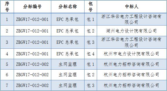 國網浙江省電力公司2017年新能源光伏項目配套工程服務類招標采購的評標工作已結束。根據經評標委員會的評審結果,經招標領導小組批準,各標包的中標情況如下: