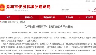 12月12日,安徽省蕪湖市住建局發布《關于加快推進可再生能源建筑應用的通知》,《通知》進一步明確了對可再生能源建筑應用的要求