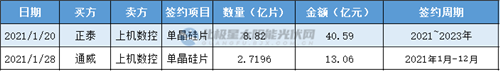 1月20日,無錫上機數控股份有限公司全資子公司弘元新材料(包頭)有限公司與正泰電器全資子公司浙江正泰太陽能科技有限公司、海寧正泰新能源科技有限公司、鹽城正泰新能源科技有限公司、鹽城正泰太陽能科技有限公司、海寧正泰太陽能科技有限公司和杭州民泰進出口貿易有限公司簽訂了單晶硅片采購合同。2021~2023年,正泰將向上機數控采購單晶硅片8.82億片(上下浮動不超過10%),實際采購價格采取月度議價方式。其中2021年預計采購不低于2.1億片,2022年采購3.36億片,2023年采購3.36億片。參照PVInfolink最新公布的價格及排產計劃測算,預計合同金額約為三年總計40.59億元(含稅)。雙方約定,每個月月底之前簽訂次月補充協議,次月支付完畢相應貨款。