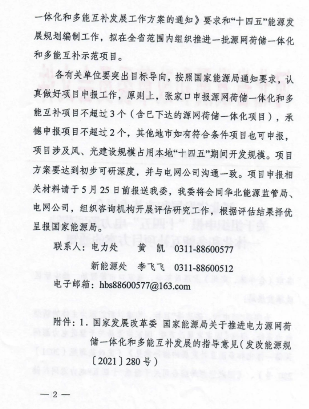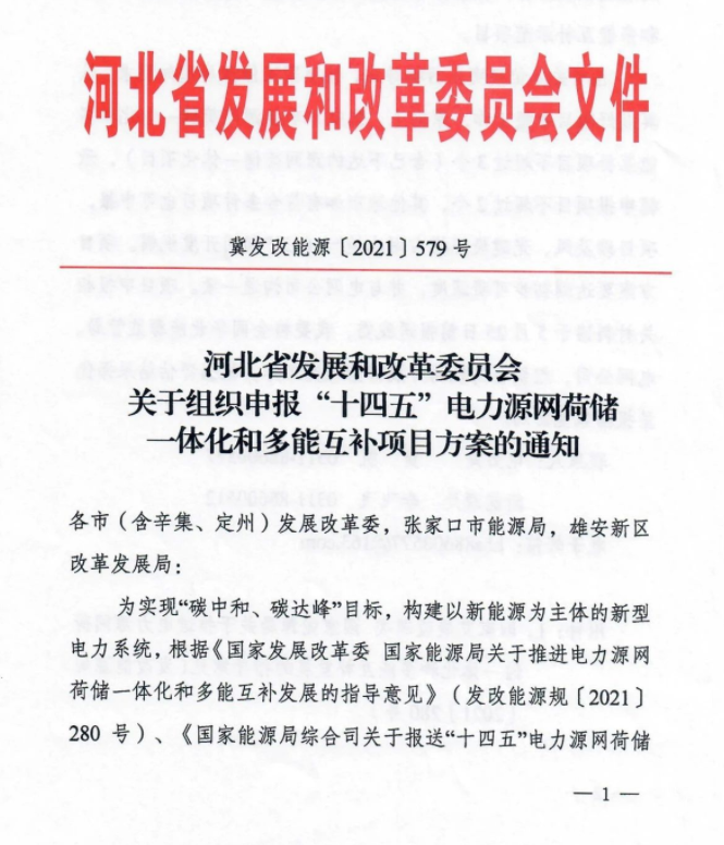 5月11日,河北省發(fā)改委發(fā)布《關(guān)于組織申報“十四五”電力源網(wǎng)荷儲一體化和多能互補(bǔ)項目方案的通知》。項目申報相關(guān)材料應(yīng)于5月25日前報送河北省發(fā)改委。