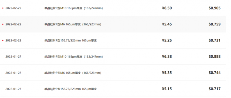 2月22日,隆基宣布上調硅片價格,與上月報價(1月27日)相比,不同尺寸的硅片價格上漲0.1~0.12元/片,漲幅為1.88%~1.94%。