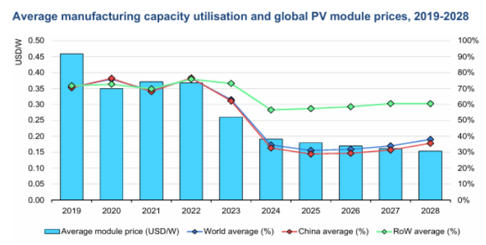 圖3 全球2019~2028年平均產(chǎn)能利用率和光伏組件價格