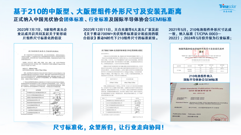 作為210的堅定推動者和引領者,天合光能積極倡導組件尺寸標準化,減少組件尺寸頻繁迭代帶來行業困擾。基于210的中版型、大版型組件外形尺寸及安裝孔距離,正式納入中國光伏協會團體標準、行業標準及國際半導體協會SEMI標準。