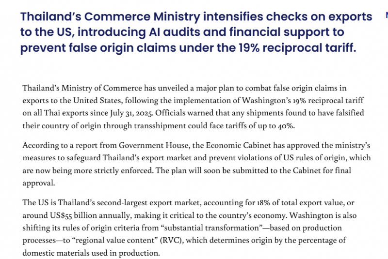 此外,泰國政府已承諾引入人工智能系統,用于核查美國出口貨物的區域價值含量(RVC)證書,系統處理能力將大幅提升——從以往每月約90份,預計至2025年底將增至每月8,000份。政府已為此撥出1290萬泰銖專項預算用于系統開發。