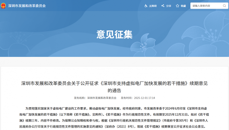 深圳市發(fā)展和改革委員會關(guān)于公開征求《深圳市支持虛擬電廠加快發(fā)展的若干措施》續(xù)期意見的通告