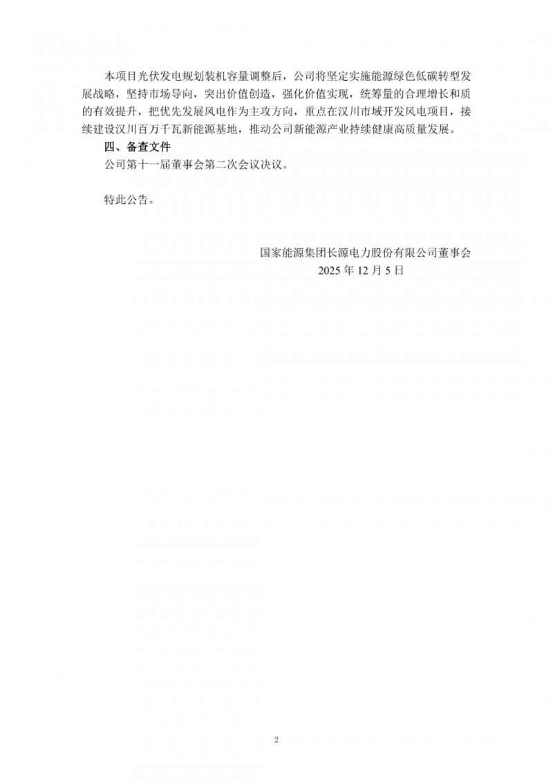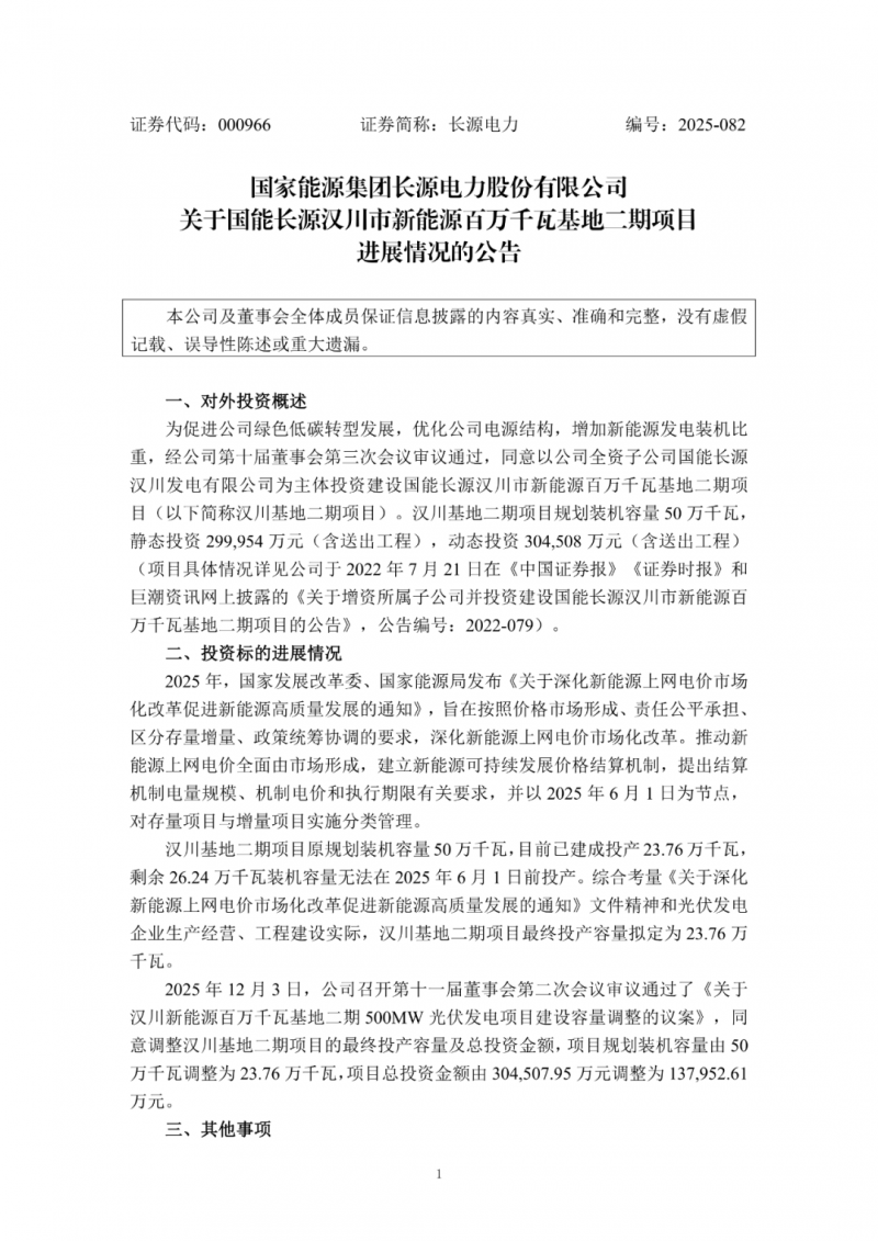 12月5日,國家能源集團長源電力股份有限公司發布《關于國能長源漢川市新能源百萬千瓦基地二期項目進展情況的公告》、《關于國能長源漢川市新能源百萬千瓦基地三期項目進展情況的公告》、《關于國能長源荊門市源網荷儲百萬千瓦新能源基地鐘祥子項目進展情況的公告》。