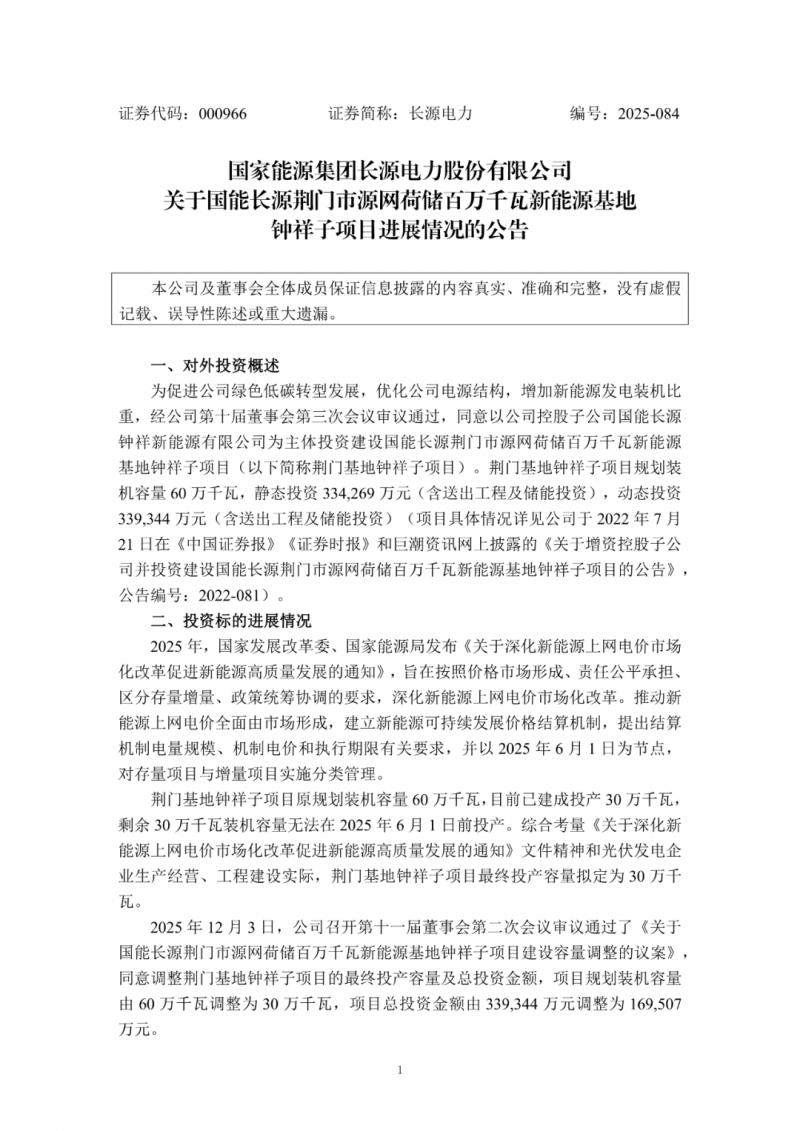 國能長源荊門市源網荷儲百萬千瓦新能源基地鐘祥子項目,因剩余300MW裝機容量無法在2025年6月1日前投產,長源電力決定將建設容量由600MW調整為300MW,投資金額由33.93億元調整為16.95億元。