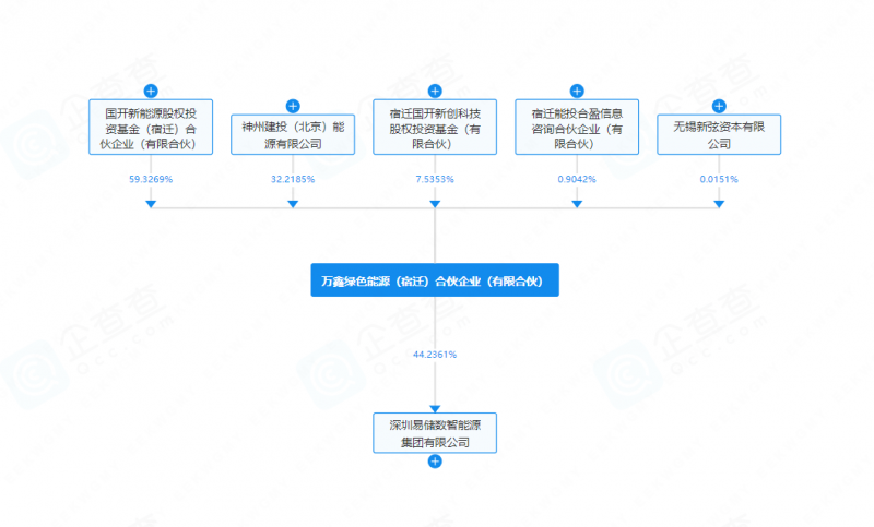 該公司于9月提交注冊,從成立到接手深圳易儲,尚不足20天。翻開其股東名單,第一大股東為國開新能源股權投資基金(宿遷)合伙企業(有限合伙),是錫創投管理的宿遷政府引導基金,出資額比例達到98.4741%。第二大股東為宿遷能投合盈信息咨詢合伙企業(有限合伙),出資額比例為1.5009%,其股東為9個自然人。第三大股東為無錫新弦資本有限公司,是國開新能源股權投資基金(宿遷)合伙企業(有限合伙)的基金管理人無錫國聯新創私募投資基金有限公司旗下子公司,出資額比例為0.025%。