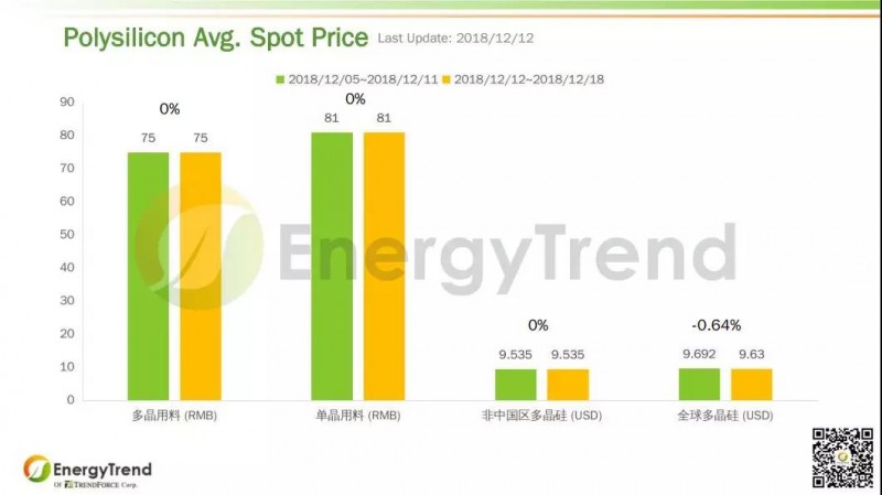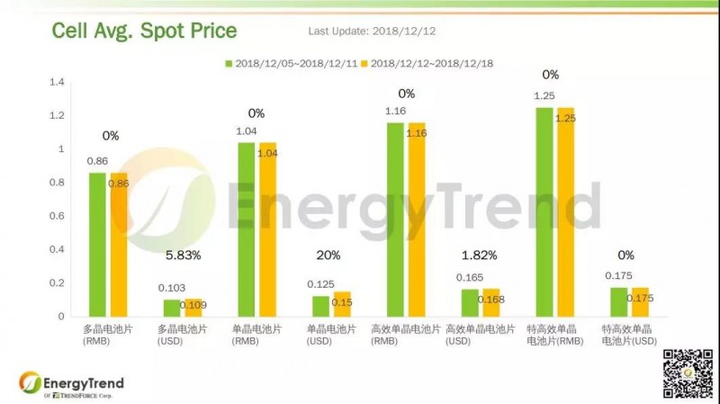 12月12日的報價顯示電池片海外市場行情見張。常規多晶電池片人民幣價格維持在 RMB0.86/W 不變;美金價格從 US$0.103/W 來到 US$0.109/W,增長了 5.83%。常規單晶電池片的人民幣均價為 RMB1.04/W,與上周持平;美金均價上漲了 20%,去至 US$0.15/W。高效單晶電池片人民幣報價也保持不變,為 RMB1.16/W;其先前的美金報價為 US$0.165/W,最新一周增長了 1.82% 來到 US$0.168/W。特高效單晶電池片的人民幣和美金價格均保持不變,分別為 RMB1.25/W 和 US$0.175/W。