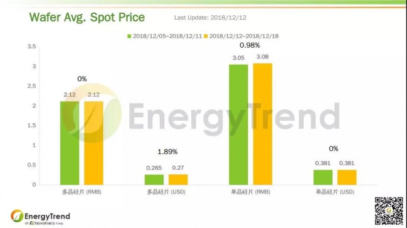 在最新一期報價中,光伏組件產品市場相對穩定,所有產品的均價都保持不變。270W多晶組件的人民幣報價和美金報價分別為 RMB1.84/W 和 US$0.211/W。280W多晶組件兩個幣種報價分別為 RMB1.87/W 和 US$0.229/W。290W單晶組件人民幣和美金最新報價分別為 RMB1.89/W 和 US$0.253/W。300W單晶組件的人民幣報價和美金報價依舊為 RMB2.13/W 和 US$0.275/W。
