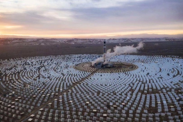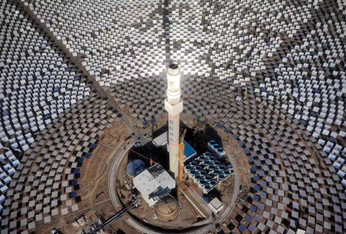 航拍光熱發電站——鏡場由12000多臺定日鏡組成,圍繞著高達260米的吸熱塔,總采光面積達140萬平方米