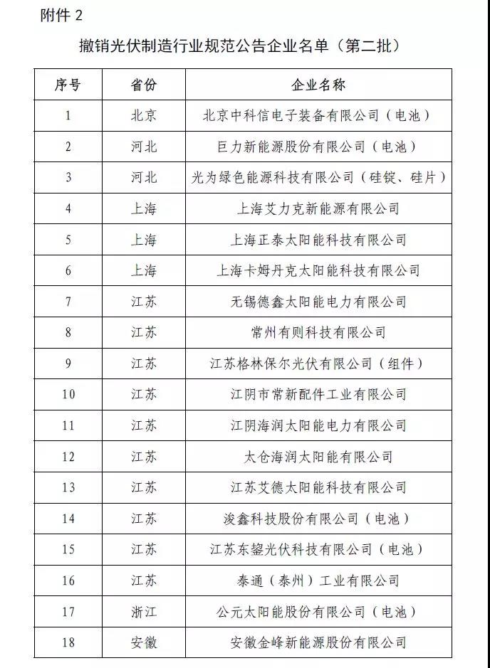 2、撤銷光伏制造行業規范公告企業名稱(第二批)