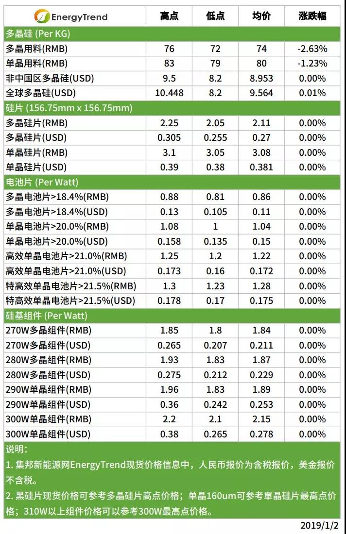 受到海外假期與中國國內(nèi)階段性標(biāo)案結(jié)束,本周組件市場的氣氛明顯放緩。目前中國國內(nèi)一般多晶 (270W~275W) 組件價格維持在1.80~1.85RMB/W,高效多晶(280~285W) 組件價格維持在1.83~1.93RMB/W,一般單晶(290~295W) 組件價格維持在1.83~1.96RMB/W,高效單晶(300~305W) 組件價格維持在2.1~2.20RMB/W,特高效單晶(>310W) 組件價格維持在2.23RMB/W的價位。海外一般多晶組件價格維持在0.207~0.265USD/W,高效多晶組件價格維持在0.212~0.275USD/W,一般單晶組件價格維持在0.242~0.36USD/W,高效單晶組件價格維持在0.265~0.38USD/W。