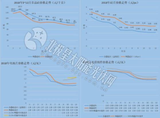 據北極星太陽能光伏網統計,過去的2018年,多晶硅降幅超30%;多晶硅片、單晶硅片降幅分別為54.1%、41.9%;多晶電池片、單晶電池片的降幅分別為44.3%、41.8%;多晶組件、單晶組件的降幅則分別為29.8%、27.8%。