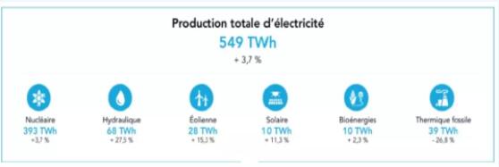 2018年全年法國本土的發(fā)電總量549TWh(5490億千瓦時),其中核電393TWh(71.6%)、水電68TWh(12.4%)、風(fēng)電28 TWh(5.1%)、火電39TWh(7.1%)、太陽能發(fā)電10TWh(1.8%)、生物質(zhì)發(fā)電10TWh(1.8%)。