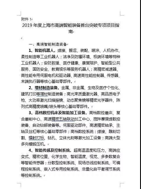 日前,上海市經信委發布《關于開展2019年度上海市高端智能裝備首臺突破專項申報工作的通知》指出,對首臺突破項目將采取無償資助方式,每個項目支持比例不超過首臺裝備銷售合同金額的30%。對被評為國際首臺裝備項目,按合同金額的20-30%比例進行支持,支持金額不超過3000萬元。