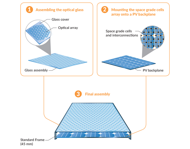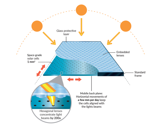 為了達到這樣的高效率,Insolight 采用獨特設計。它將電池板的防護玻璃嵌入透鏡陣列,這使得光線更加了集中數百倍。在這一光學層下面,直射陽光能在高性能太空級的太陽能電池陣列上聚焦。