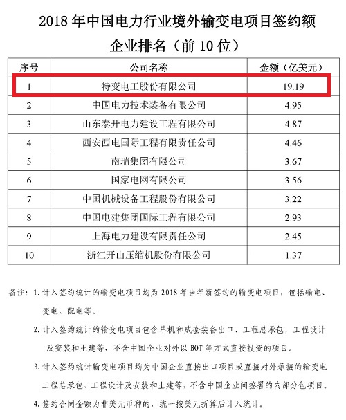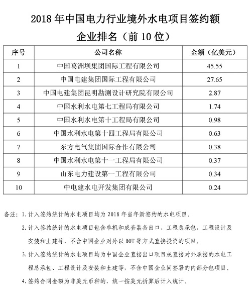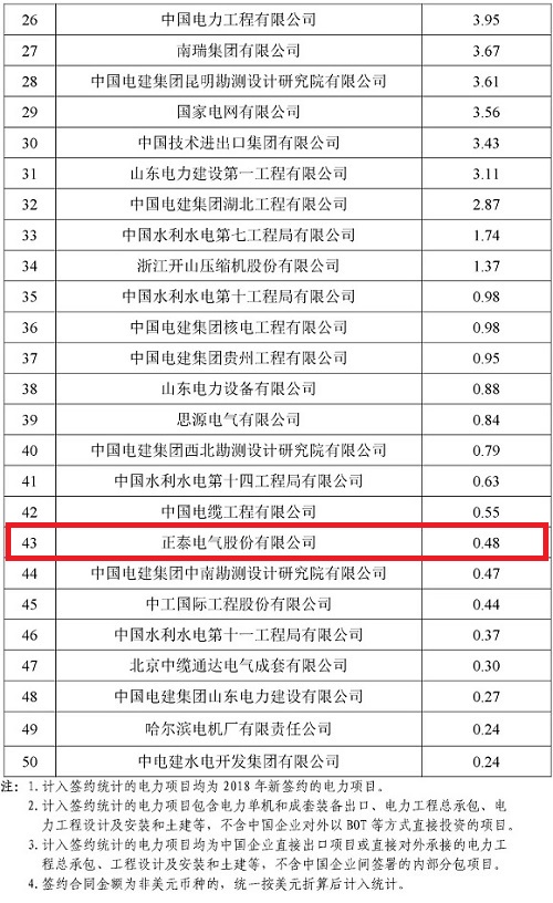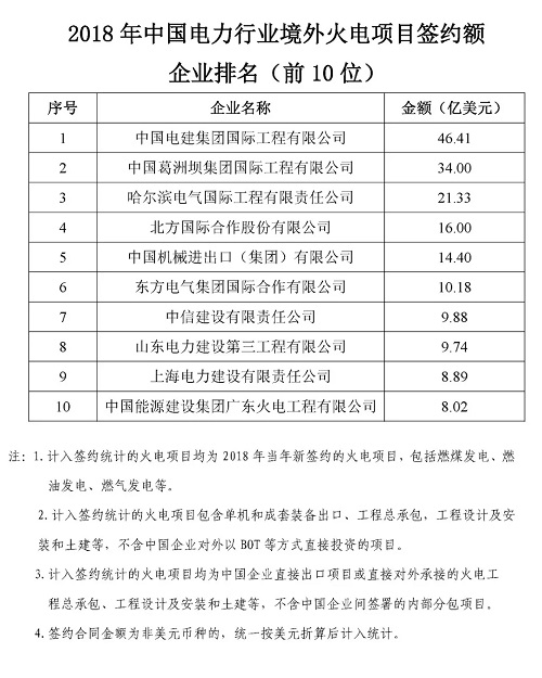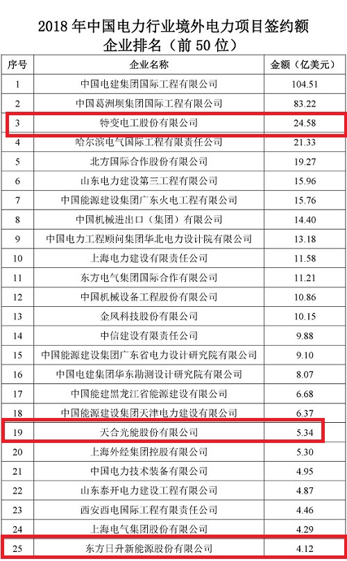 根據(jù)機(jī)電商會(huì)統(tǒng)計(jì),2018年,中國(guó)電力行業(yè)企業(yè)參與境外電力項(xiàng)目投(議)標(biāo)并最終實(shí)現(xiàn)簽約的項(xiàng)目399個(gè),簽約合同總金額466.8億美元,同比增長(zhǎng)5.8%,簽約發(fā)電裝機(jī)總?cè)萘?013.7萬(wàn)千瓦。根據(jù)各重點(diǎn)企業(yè)報(bào)送的2018年境外電力項(xiàng)目的新簽約情況,機(jī)電商會(huì)對(duì)企業(yè)簽約額進(jìn)行了排名。現(xiàn)將排名前50位的企業(yè)名單及各子行業(yè)簽約額排名前10位的企業(yè)名單予以發(fā)布。