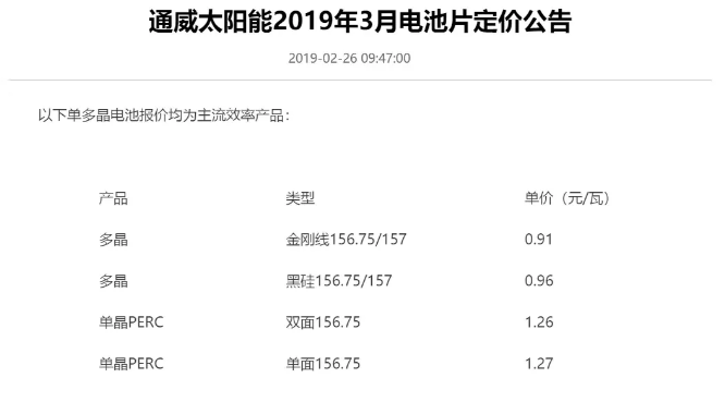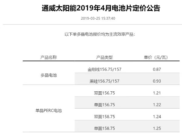 昨日,通威股份發布2019年4月電池片定價公告,多晶PERC電池片價格從0.91-0.96元/瓦下降至0.87-0.93元/瓦。單晶PERC電池片價格從1.26-1.27元每瓦降至1.21-1.22元/瓦。