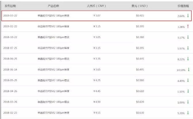 值得一提的是,在幾天前單晶巨頭隆基股份也將單晶硅片價格進行了下調,單晶硅片P型M2(厚度180μm)價格由3.15元/片下調至3.07元/片,海外報價0.415美元/片,比2月22日價格下調了2.64%。