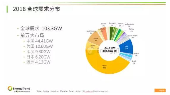回顧2018年的市場發展,全年度裝機量達到103GW,相較2017年增長4.9%。EnergyTrend預測,2019年全球光伏裝機量將達到111.3GW,相較2018年增長7.7%。展望2019年,中國占世界市場份額持續下降。2018年全球前五大市場裝機量分別是,中國44.41GW,美國10.6GW,印度9.3GW,日本6.2GW,澳洲4.13GW。