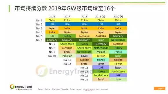 展望2019年,全球區域市場里面,GW級市場會達到16個,其中西班牙和阿拉伯是2019年值得關注的兩大市場。