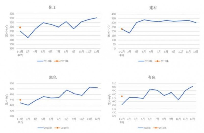 圖3 2018、2019年重點(diǎn)行業(yè)分月用電量情況