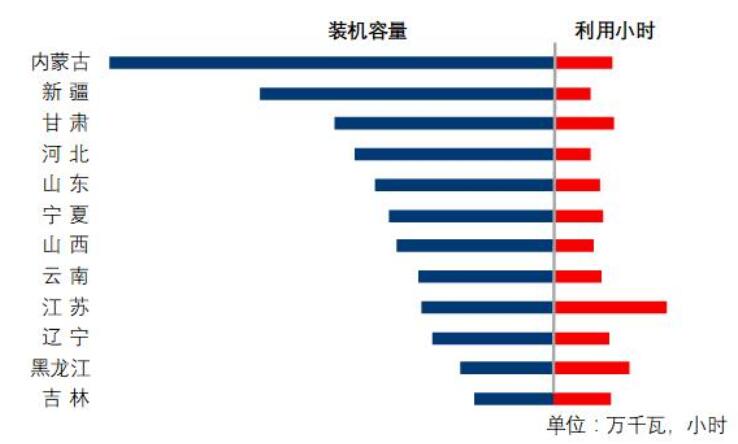 圖5 1-2月份風(fēng)電裝機(jī)較多省份風(fēng)電裝機(jī)容量和設(shè)備利用小時(shí)