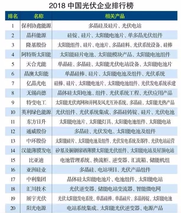 在2018年中國光伏企業(yè)排行榜中,前十名的光伏企業(yè)分別為保利協(xié)鑫能源、晶科能源、隆基股份、阿特斯太陽能、天合光能、晶澳太陽能、億晶光電、無錫尚德、特變電工、英利綠色能源。其涉及的主營業(yè)務(wù)及產(chǎn)品如下表。本文則重點介紹在這些領(lǐng)先企業(yè)之外,在產(chǎn)業(yè)鏈各端占據(jù)絕對優(yōu)勢地位的“小巨頭”企業(yè)。
