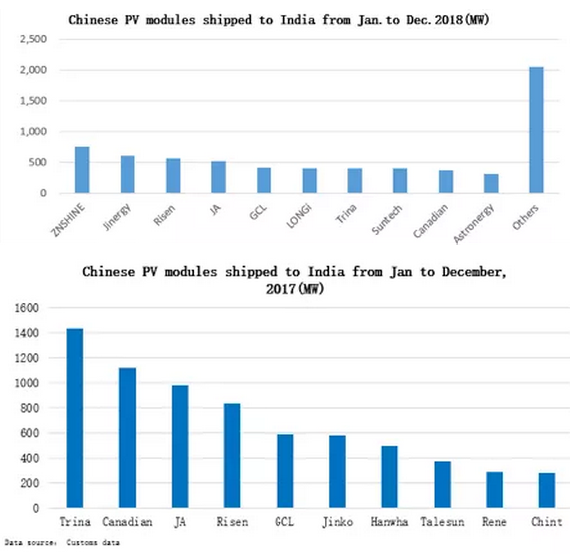 根據(jù)海關(guān)統(tǒng)計數(shù)據(jù),2017年和2018年印度市場上前十大光伏組件企業(yè)的“大變臉”也印證了上述變化。