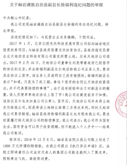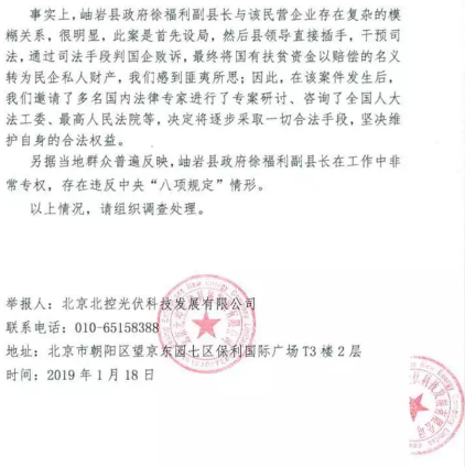 在這封“血淚控訴書”的最后還附上了北控光伏的再審申請書以及對岫巖滿族自治縣副縣長徐福利的實名舉報信。