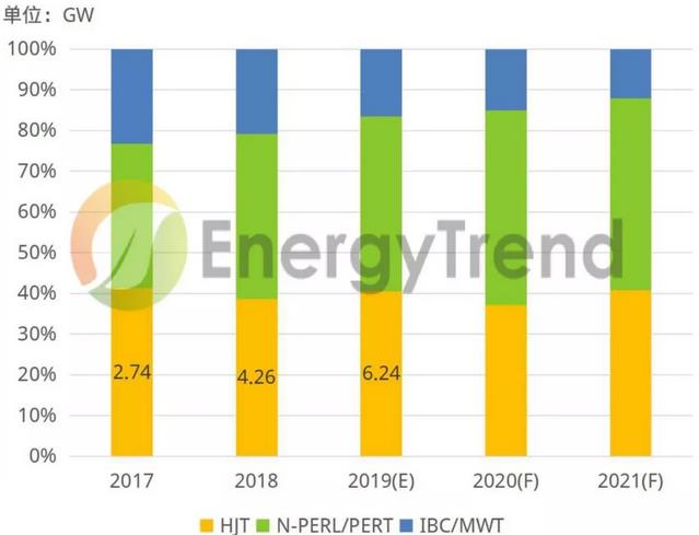 目前,公開報道進行研發或量產HJT電池的光伏企業超過20家,其中大多尚處于中試階段。集邦咨詢旗下新能源研究中心集邦新能源網EnergyTrend先進報告數據顯示,2019年HJT電池產能爬坡至6.24GW,全球前5大N型電池片企業中,有4家都是異質結太陽能電池的生產者,其中LGE與REC對N型電池的多種電池技術進行研發生產。
