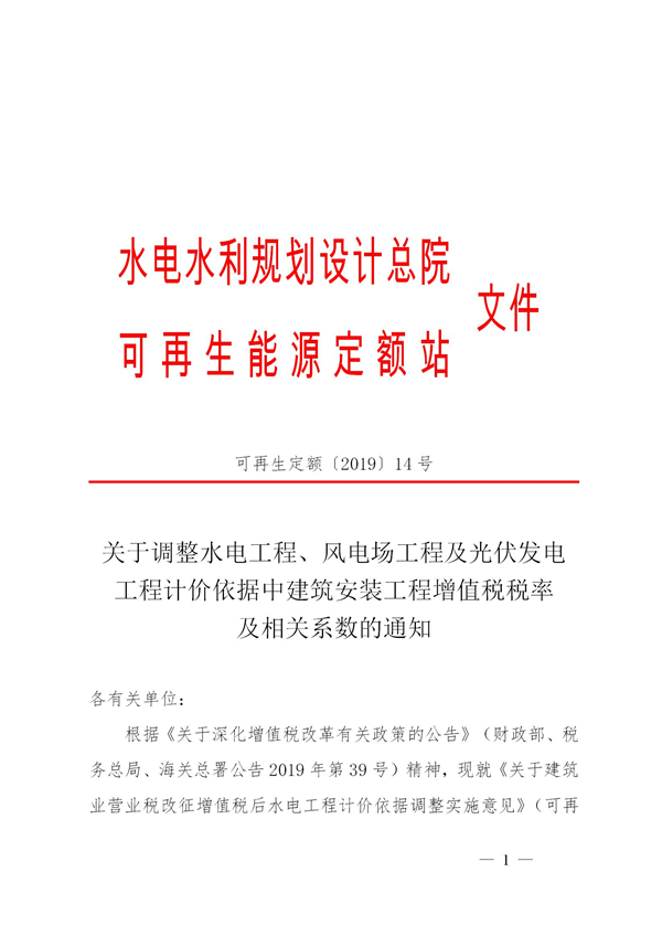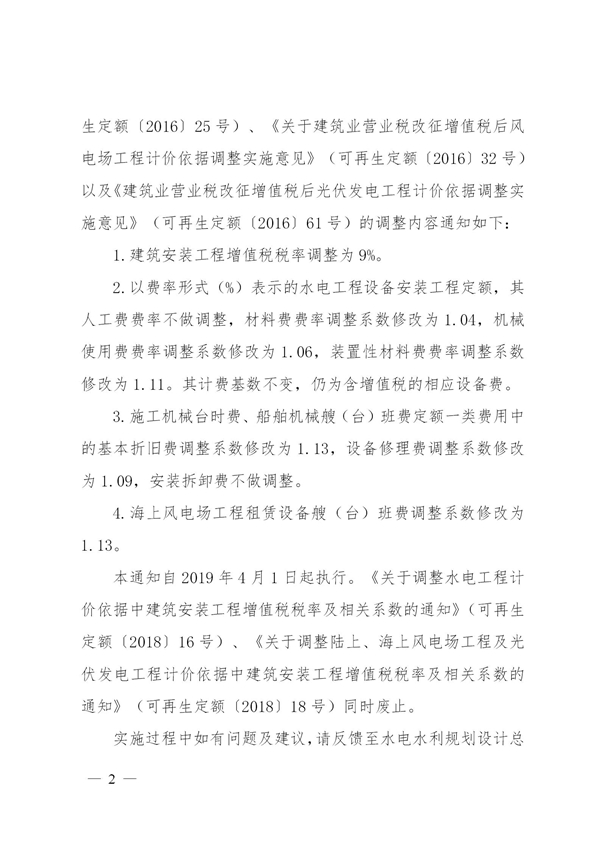 近日,水電水利規劃設計總院可再生能源定額站發布《關于調整水電工程、風電場工程及光伏發電工程計價依據中建筑安裝工程增值稅稅率及相關系數的通知》。本通知自2019年4月1日起執行。