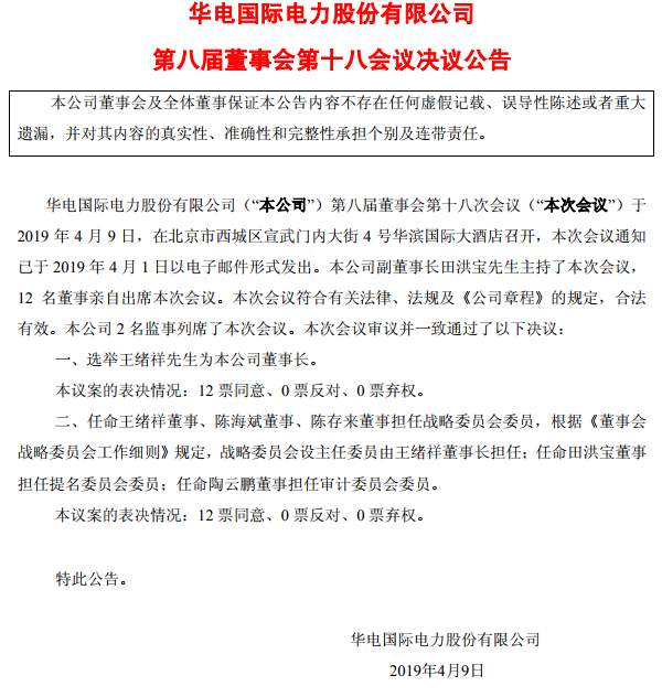 日前,華電國際發布了第八屆董事會第十八會議決議公告。會議審議一致通過了《選舉王緒祥先生為本公司董事長》等決議。