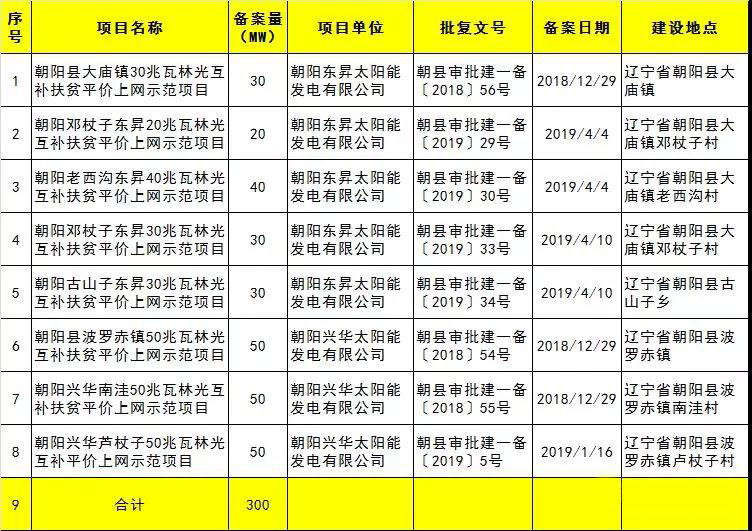 近日對部分遼寧省備案的平價上網示范項目信息整理發現,其中晶澳太陽能在遼寧省朝陽市備案300兆瓦平價上網示范項目,項目名稱均為“林光互補扶貧平價上網示范項目”,既是林光互補,又是扶貧,這個概念相當有創意的。300兆瓦項目總計分為8個子項目,項目容量最小為20兆瓦,最大為50兆瓦。