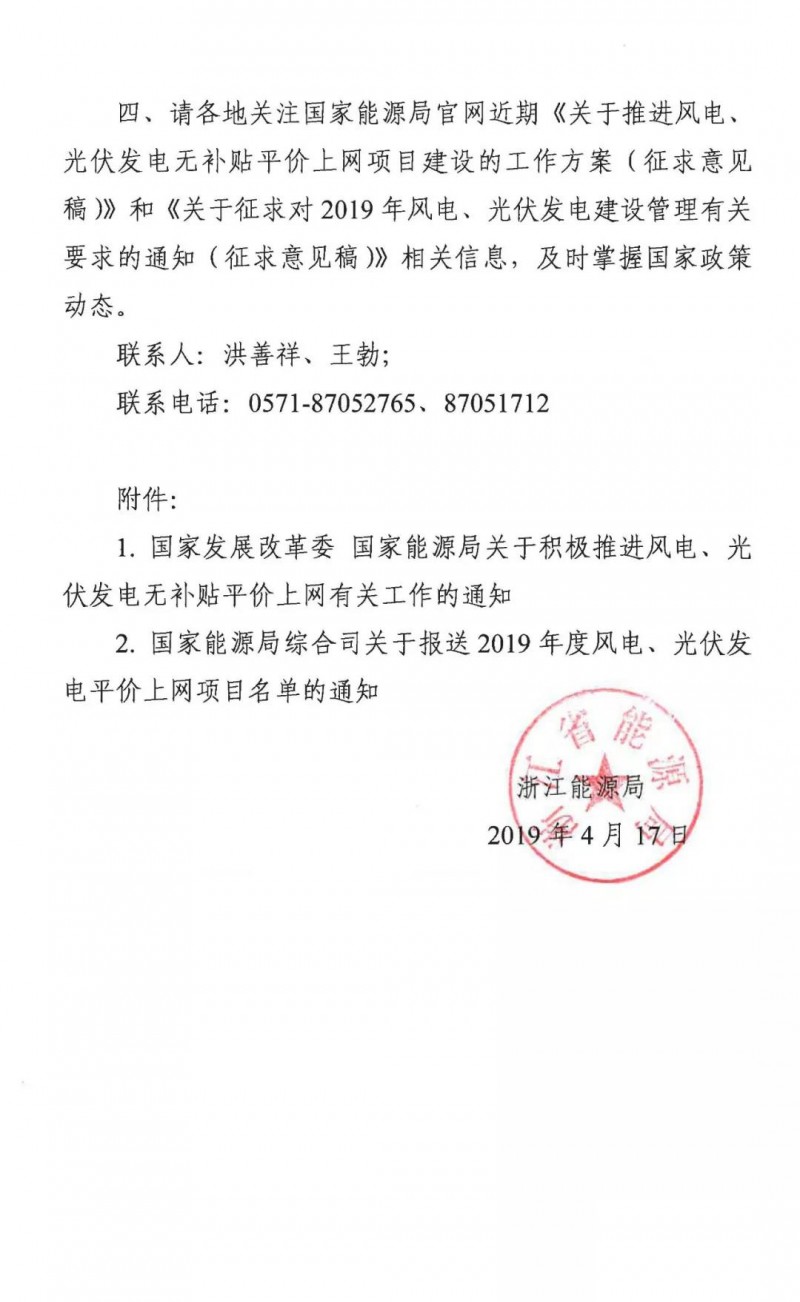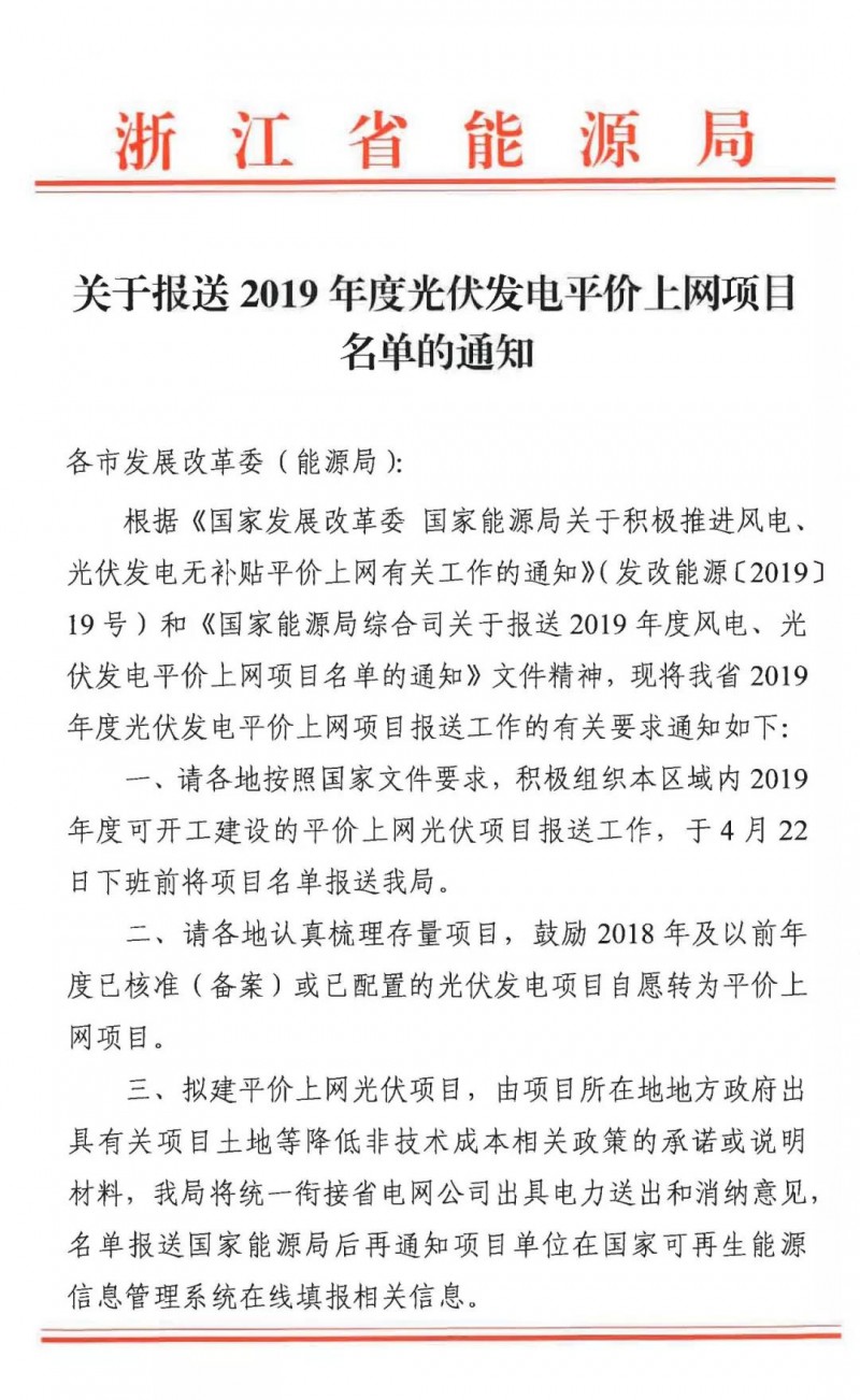浙江省能源局關于報送2019年度光伏發電平價上網項目名單的通知。