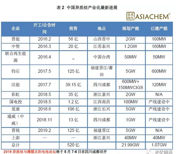 據亞化咨詢統計,2016年至今,中國異質結項目總規劃產能約達22GW,擬投資總額高達520億元,實際已建產能約為1GW。多數企業目前仍在評估或中試階段,還未形成大規模發展。