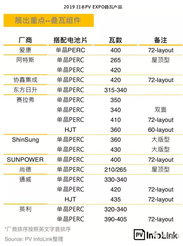 在2019 日本東京PV EXPO展會上,多家企業展出了疊瓦產品,如下表所示。可見,此次展出的疊瓦組件多搭配單晶PERC電池片,賽拉弗和通威則同時展出搭配異質結的疊瓦組件。亞化咨詢研究表明,2019年疊瓦組件產能有望達10GW。