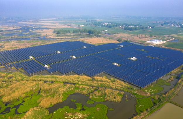 4月19日,位于安徽省固鎮縣王莊鎮釣魚臺村釣魚湖周邊密密麻麻的光伏太陽能電池板正在“收集”陽光,通過航拍鏡頭可以看到,電池板在陽光的照射下閃閃發光。據了解,該項目位于固鎮縣王莊鎮釣魚臺湖灘涂地,占地面積600畝,項目總投資約2億元,釣魚臺湖漁光互補光伏發電項目總裝機容量是20兆瓦,使用多晶硅電池組件77000多塊,采用分塊發電、集中并網方案,所發電量全額并入公共電網。電站運營期內平均年上網電量約為2370萬度,每年僅發電一項就可產生效益2000多萬元。作為全縣首個漁光互補項目,該項目利用現有灘涂地、湖面,上層發電,下層養殖,充分實現土地的綜合利用。