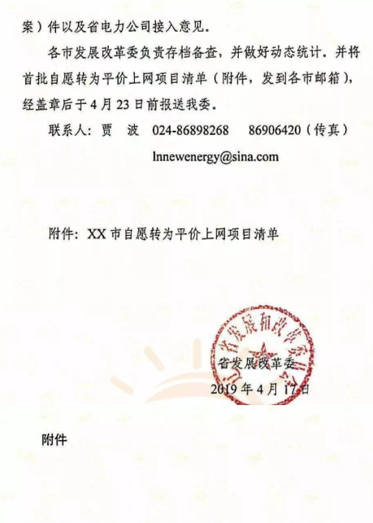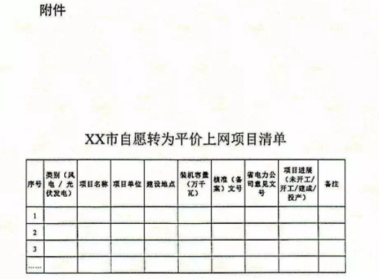 項(xiàng)目轉(zhuǎn)為平價(jià)上網(wǎng)項(xiàng)目的工作,其中2018年度及以前已核準(zhǔn)(備案)、已得到省電力公司接入意見的陸上風(fēng)電、光伏項(xiàng)目,項(xiàng)目業(yè)主可向市級(jí)發(fā)改委報(bào)送項(xiàng)目自愿轉(zhuǎn)為平價(jià)上網(wǎng)項(xiàng)目承諾書。各市發(fā)改委于4月23日前報(bào)送到省發(fā)改委。